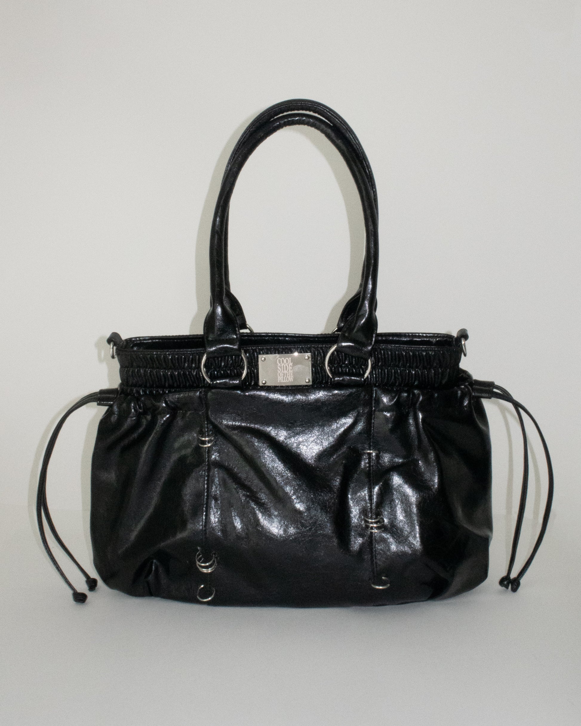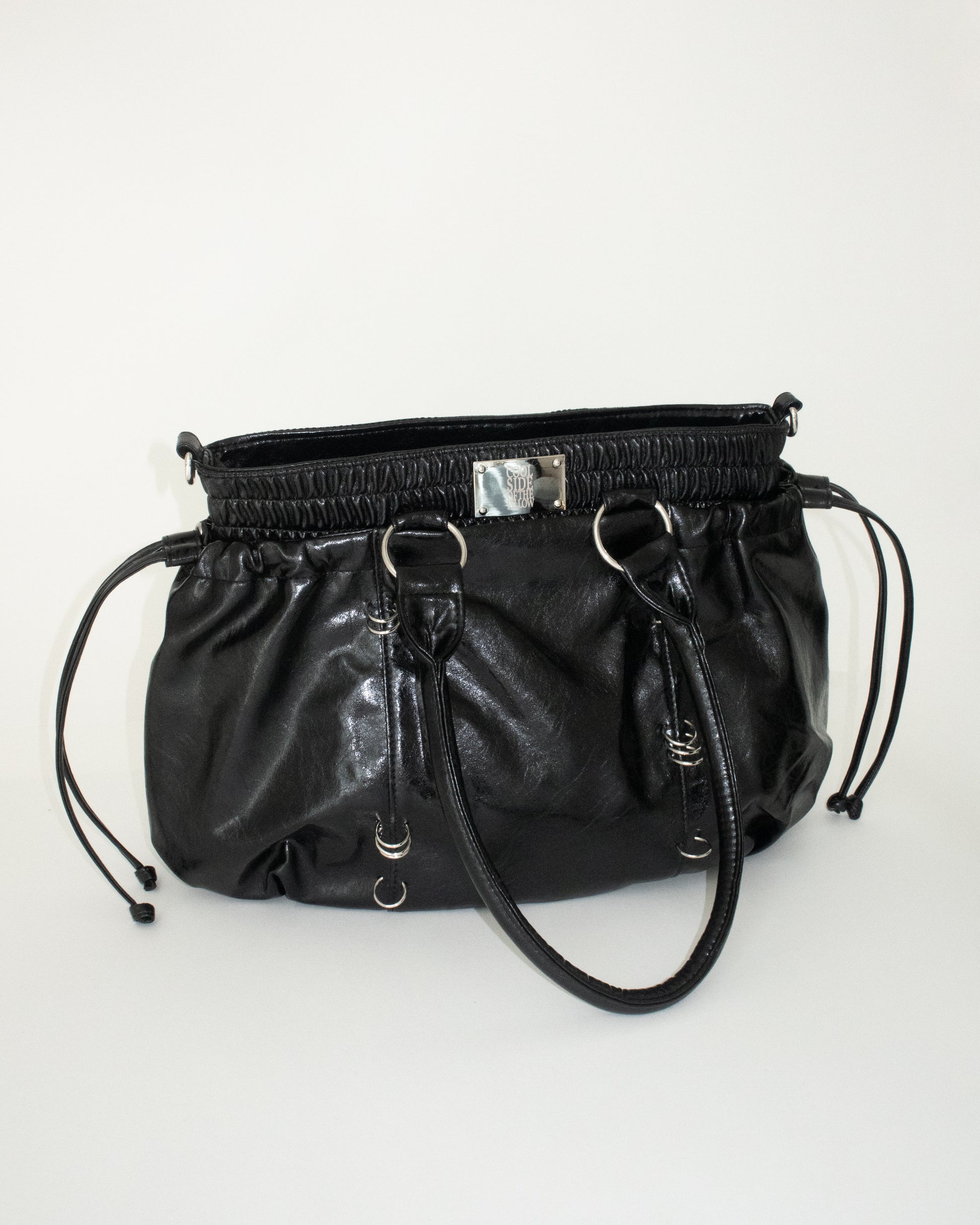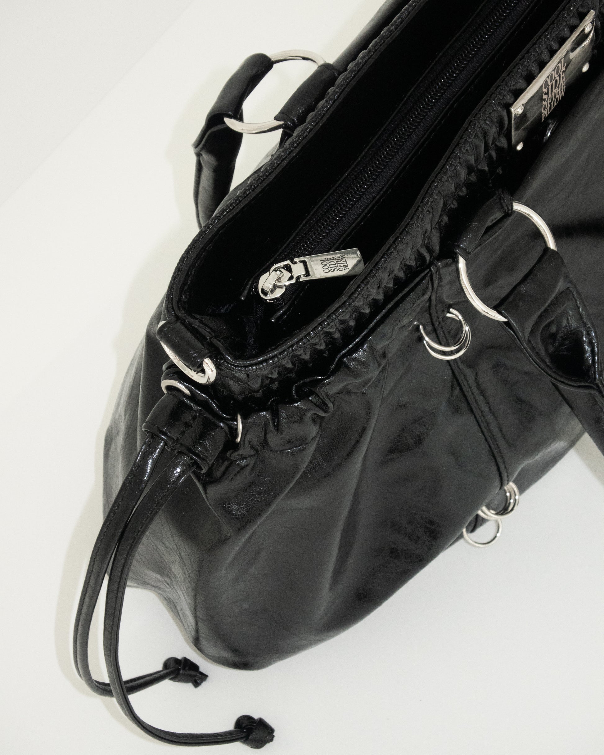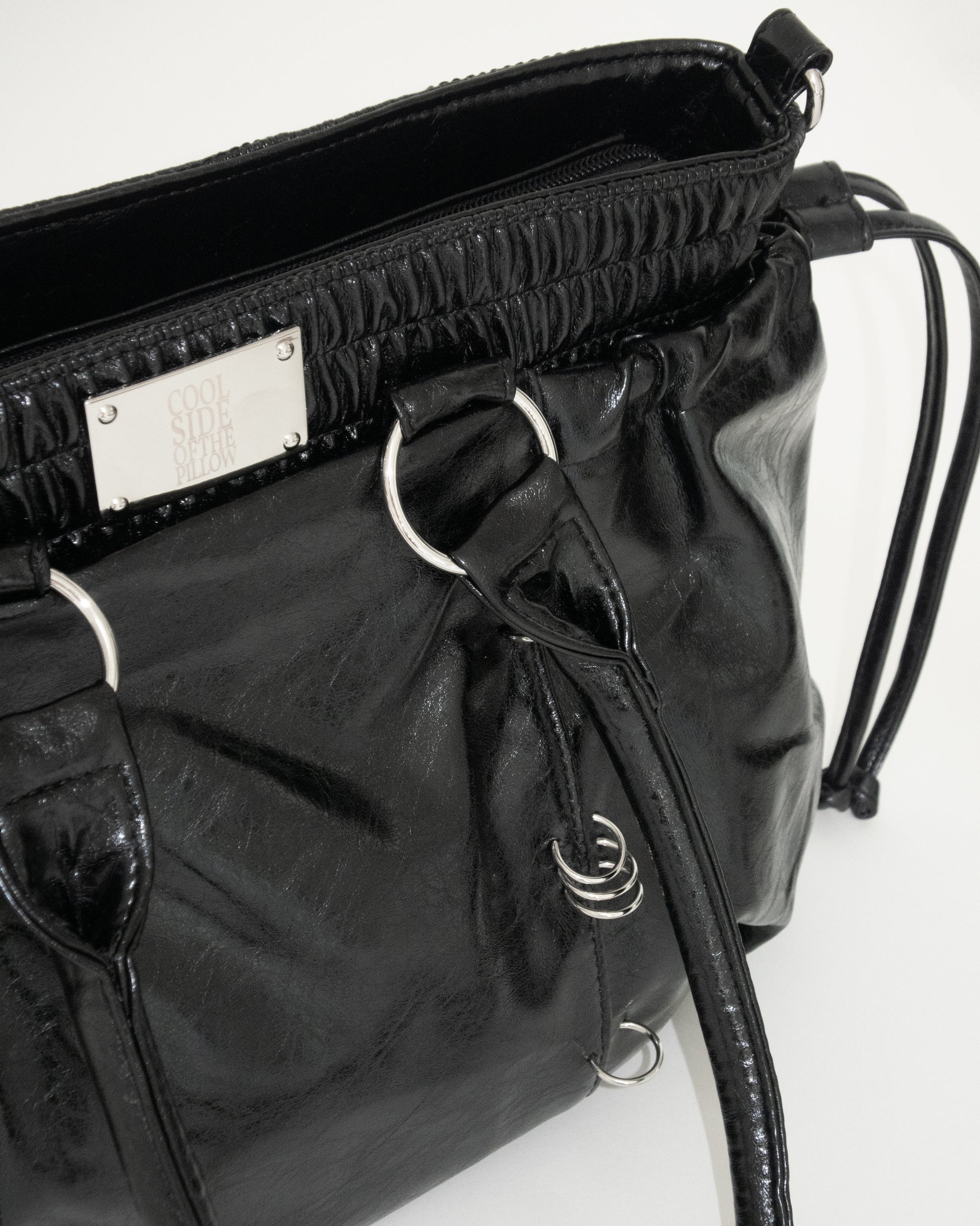 - Unique piercing detail and metal ring handle on the front exterior of the bag