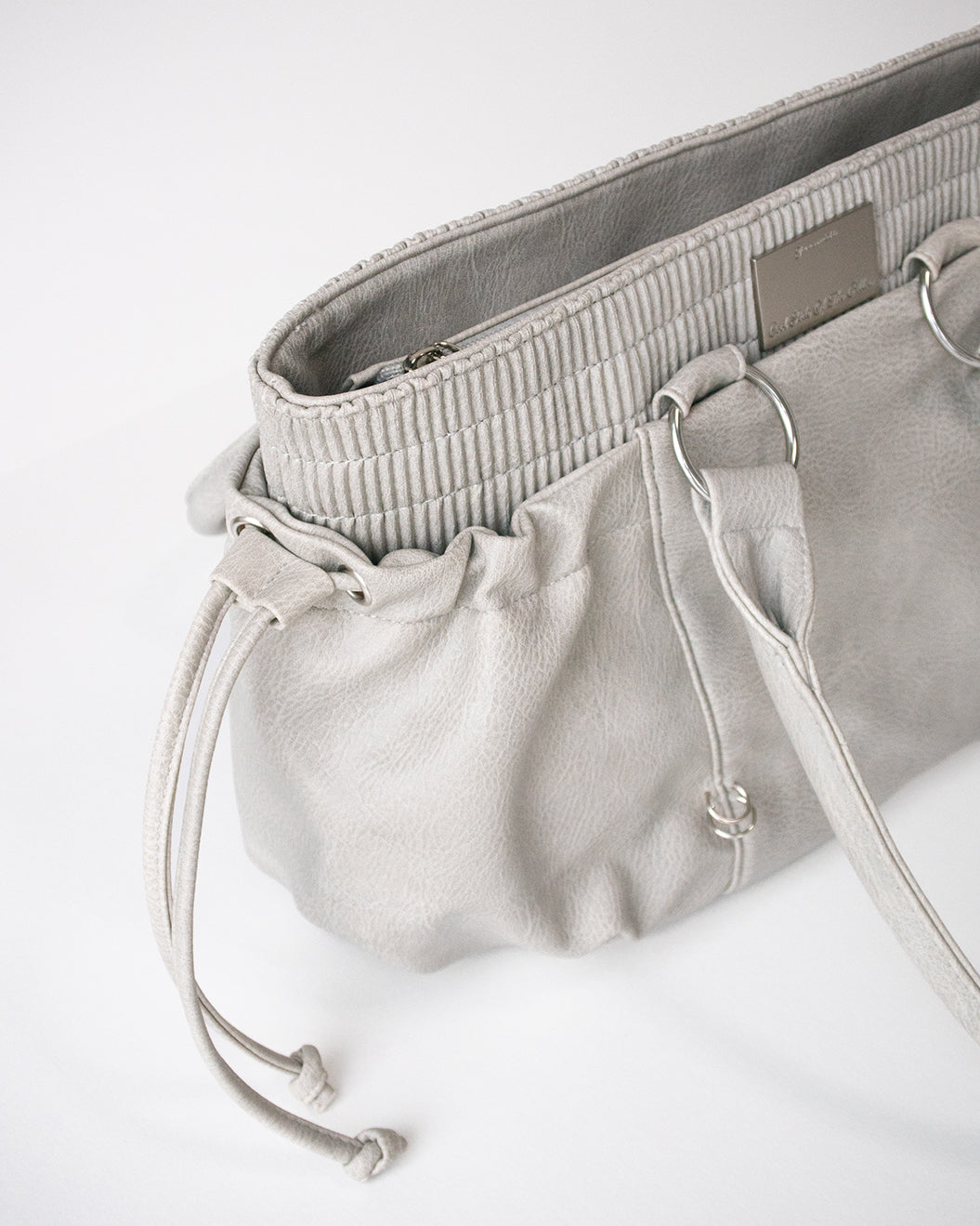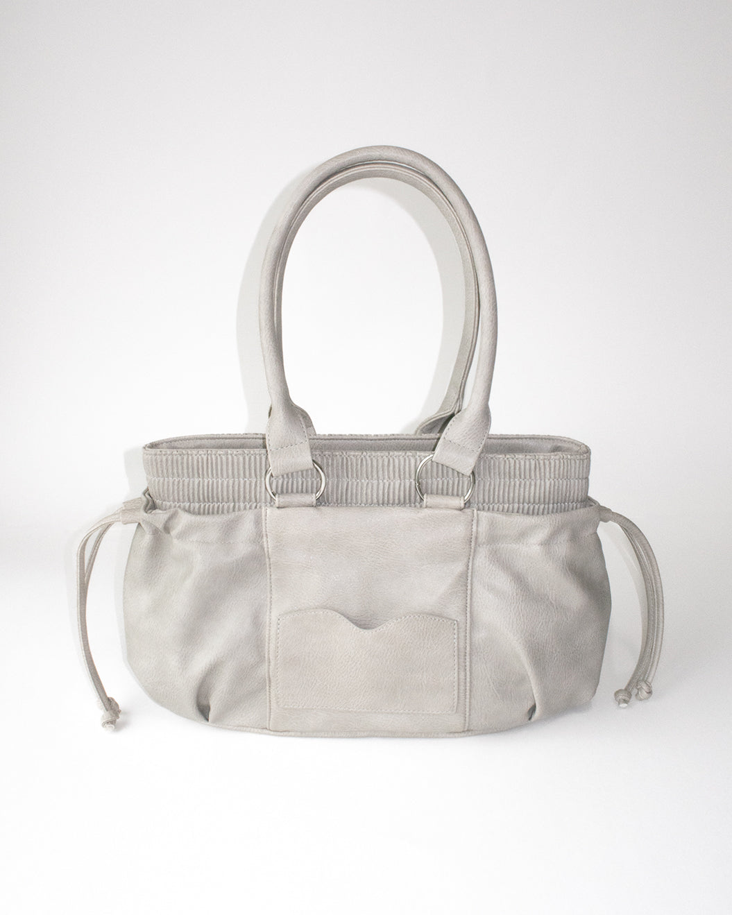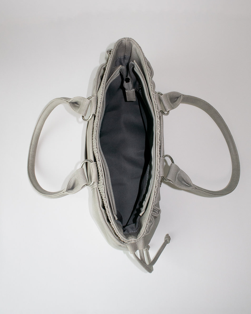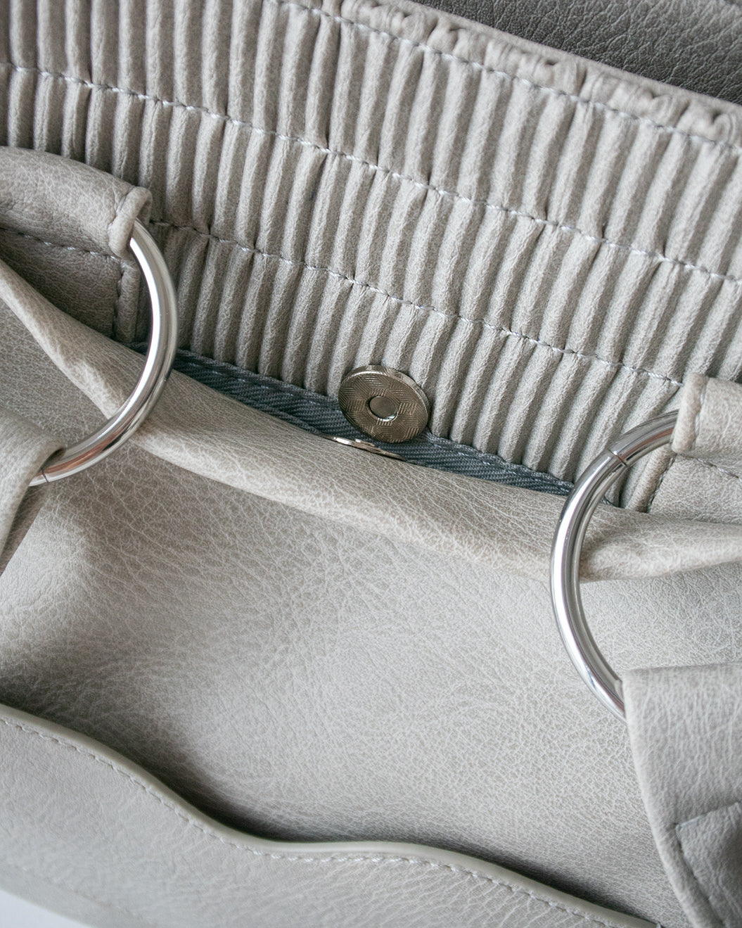 Pleated detail along the top line, silver ring accents, and rolled handles for a stable grip when carried on shoulder or by hand