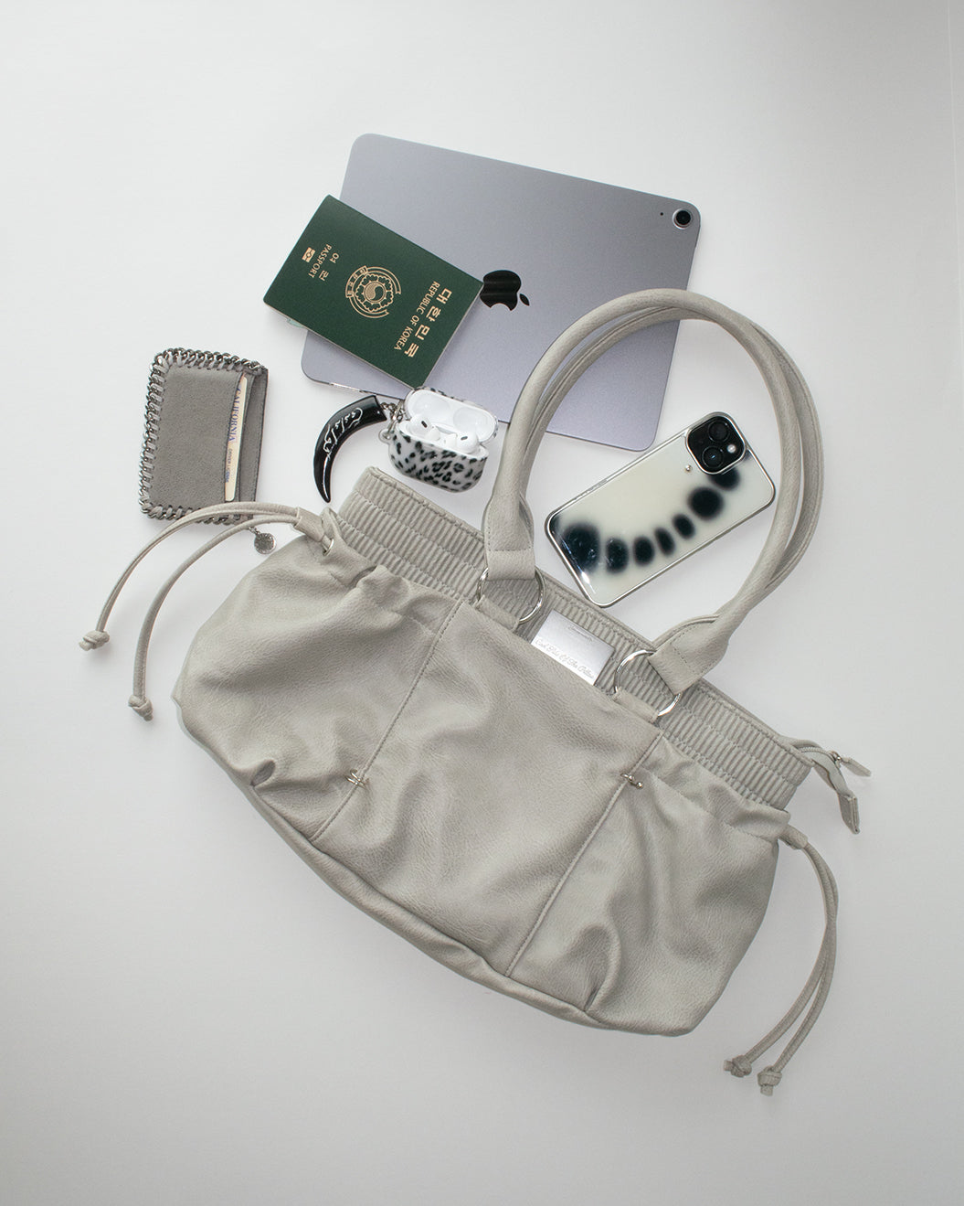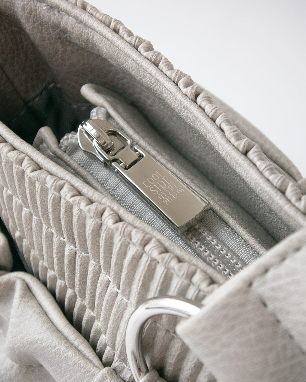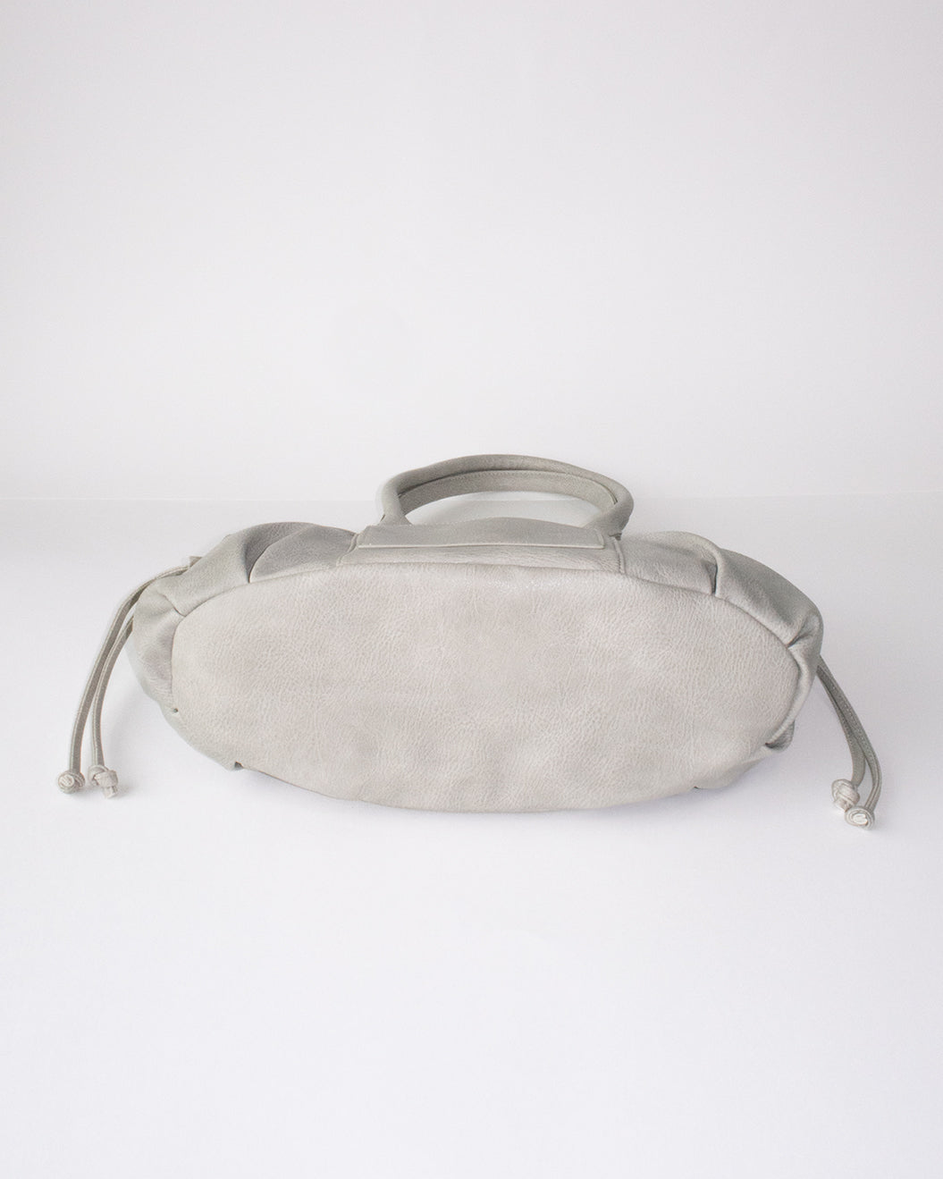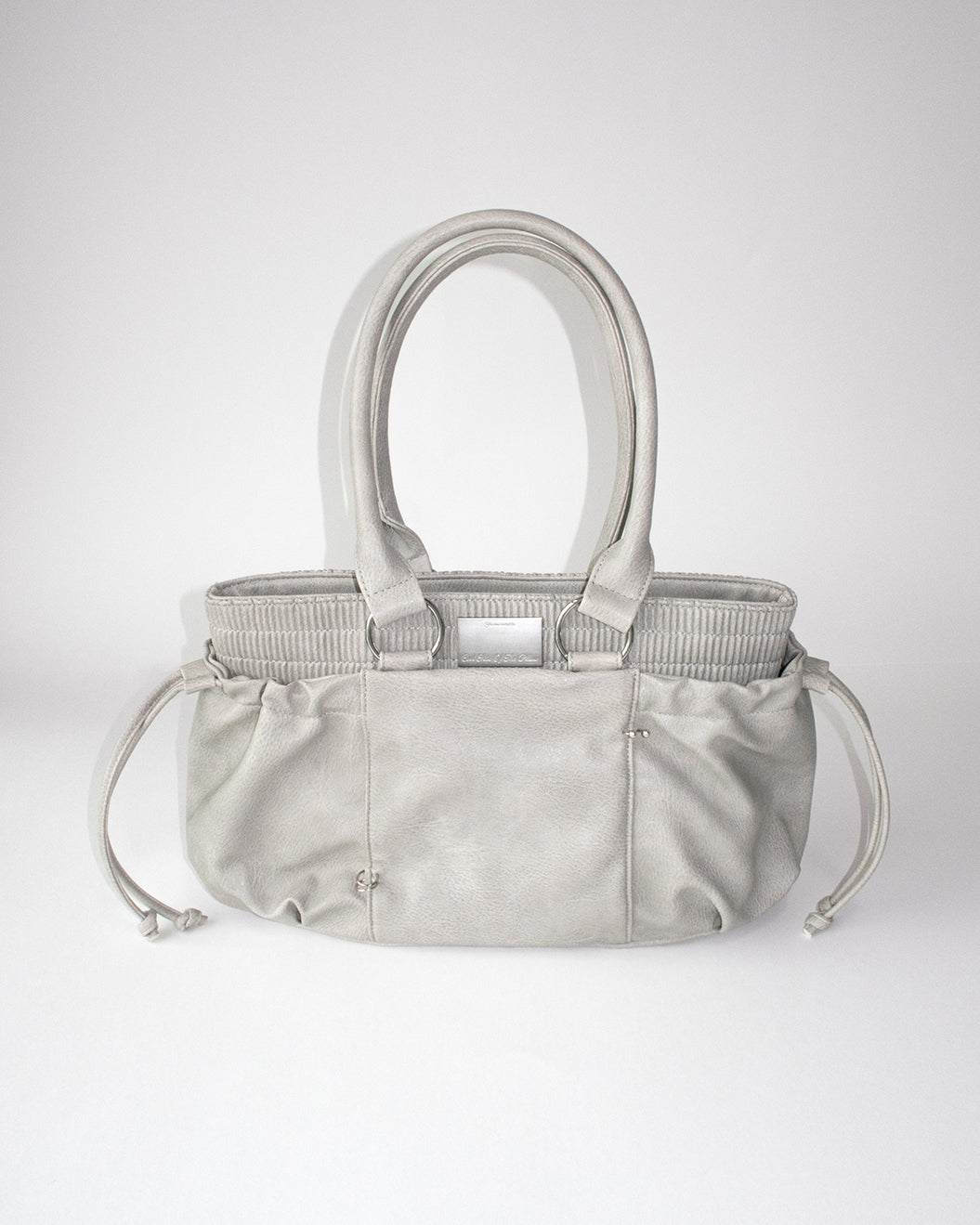 Pleated detail along the top line, silver ring accents, and rolled handles for a stable grip when carried on shoulder or by hand